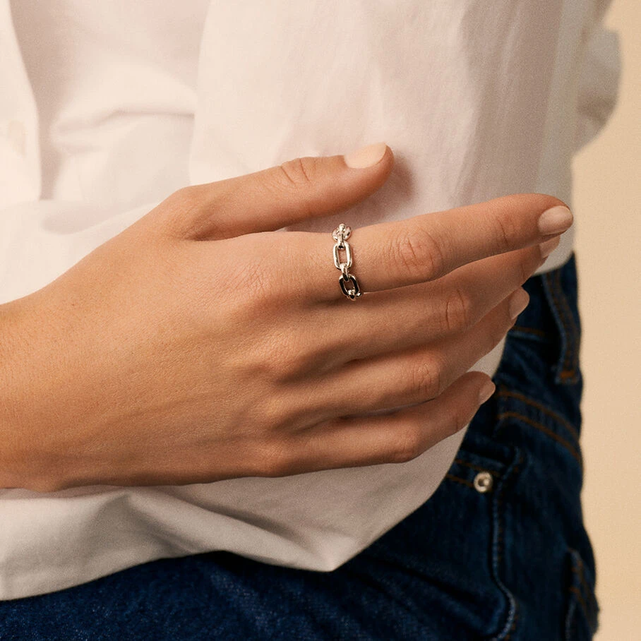Bague ouverte en argent véritable formée d’une maille rectangulaire rigide. PM: 48/50 – MM: 52/54 – GM: 56/58