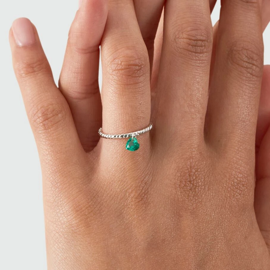 Bague, en argent véritable, avec un fil torsadé, sur lequel un oxyde de zirconium perçé et en forme de cœur, est en pampille