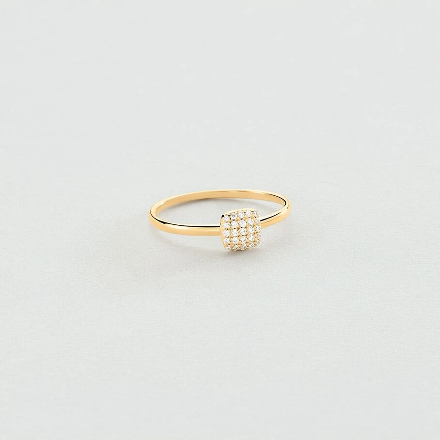 Bague fine, en argent véritable avec une couche d’or, avec un ornement de forme coussin et pavé d’oxydes de zirconium