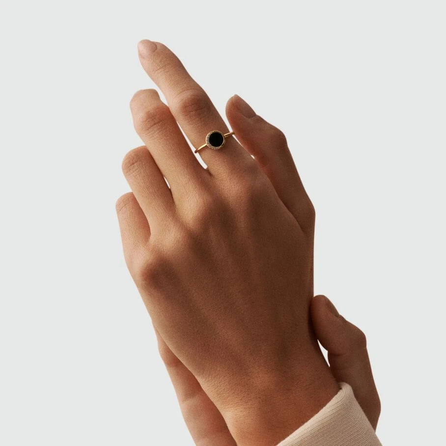 Bague, en argent dorée 750/1000, ornée d’une pastille en onyx et d’un motif lune serti d’oxydes de zirconium