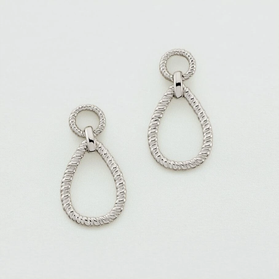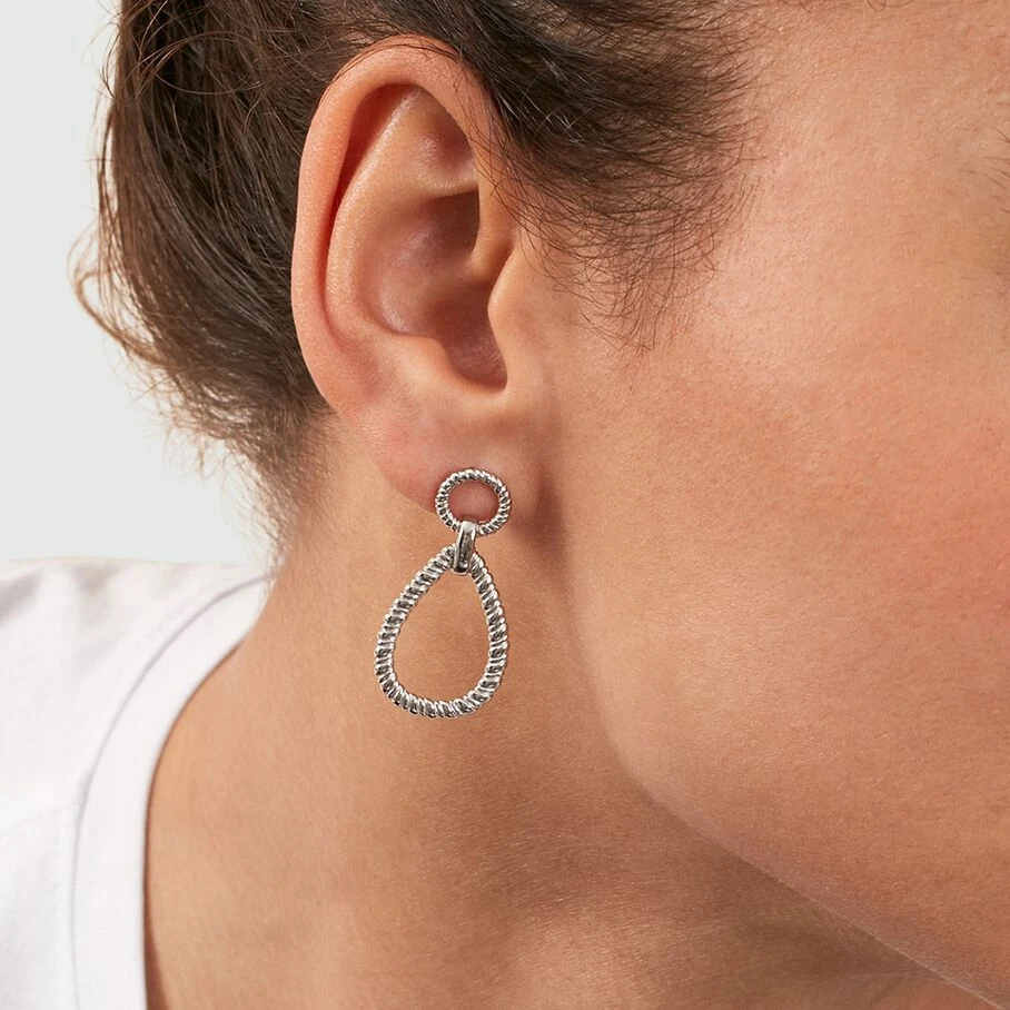 Boucles d’oreilles mi-longues, en argent véritable, dont le top est un anneau évidé torsadé au bout duquel est suspendu une goutte évidée et torsadée