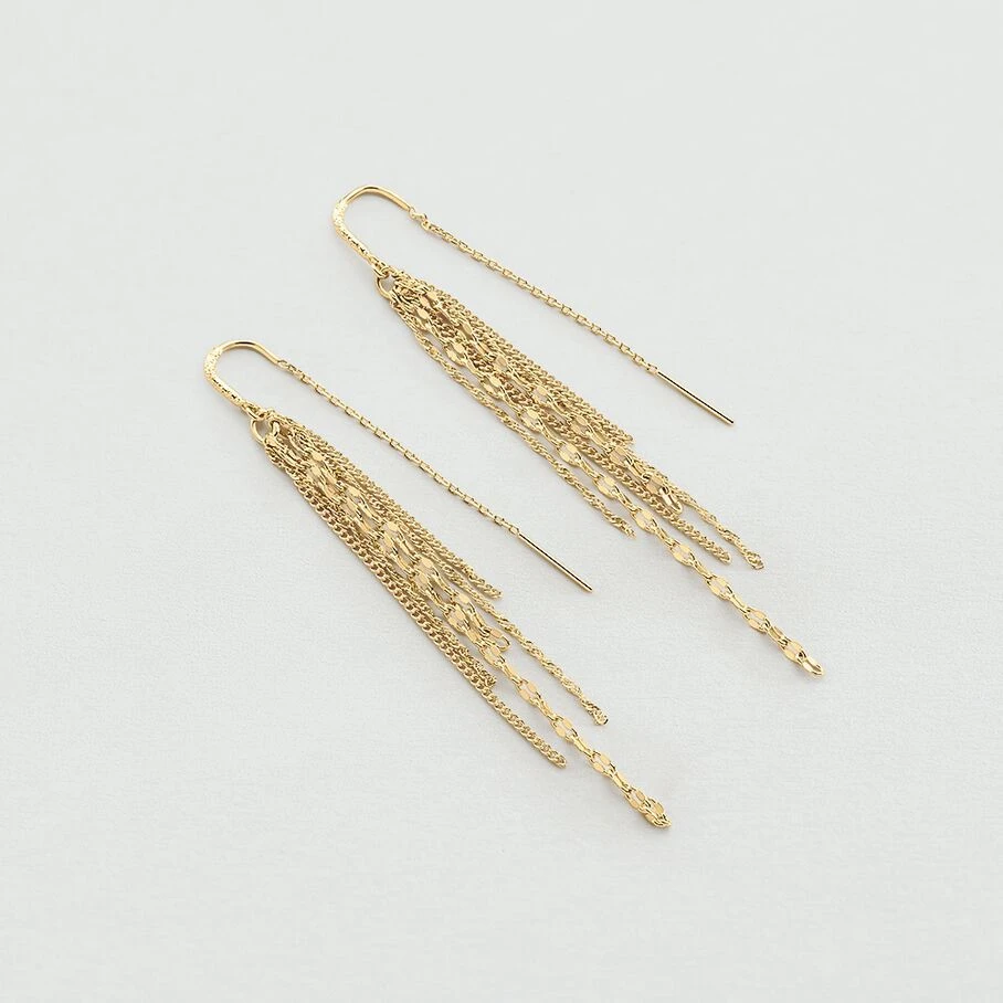 Boucles d’oreilles mi-longues, en laiton doré 750/1000, faites d’un pompom de 6 chaines de différentes longueurs