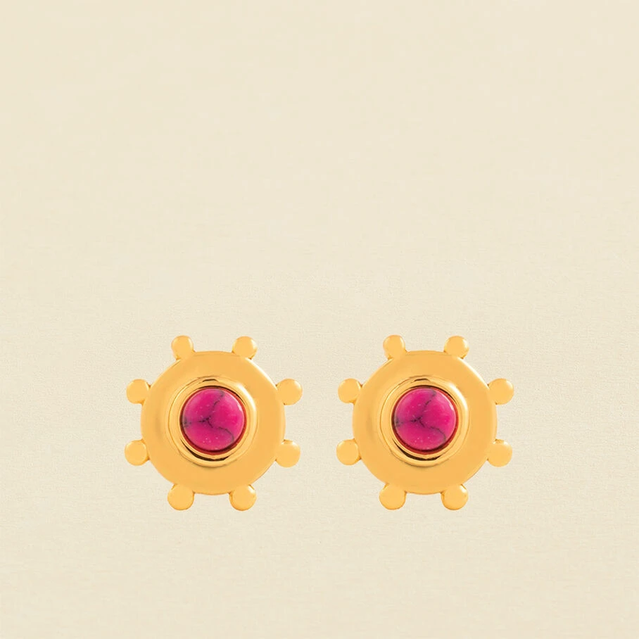 Boucles d’oreilles puces en laiton doré 750/1000, motif ‘soleil’ orné de cabochons de pierres fines