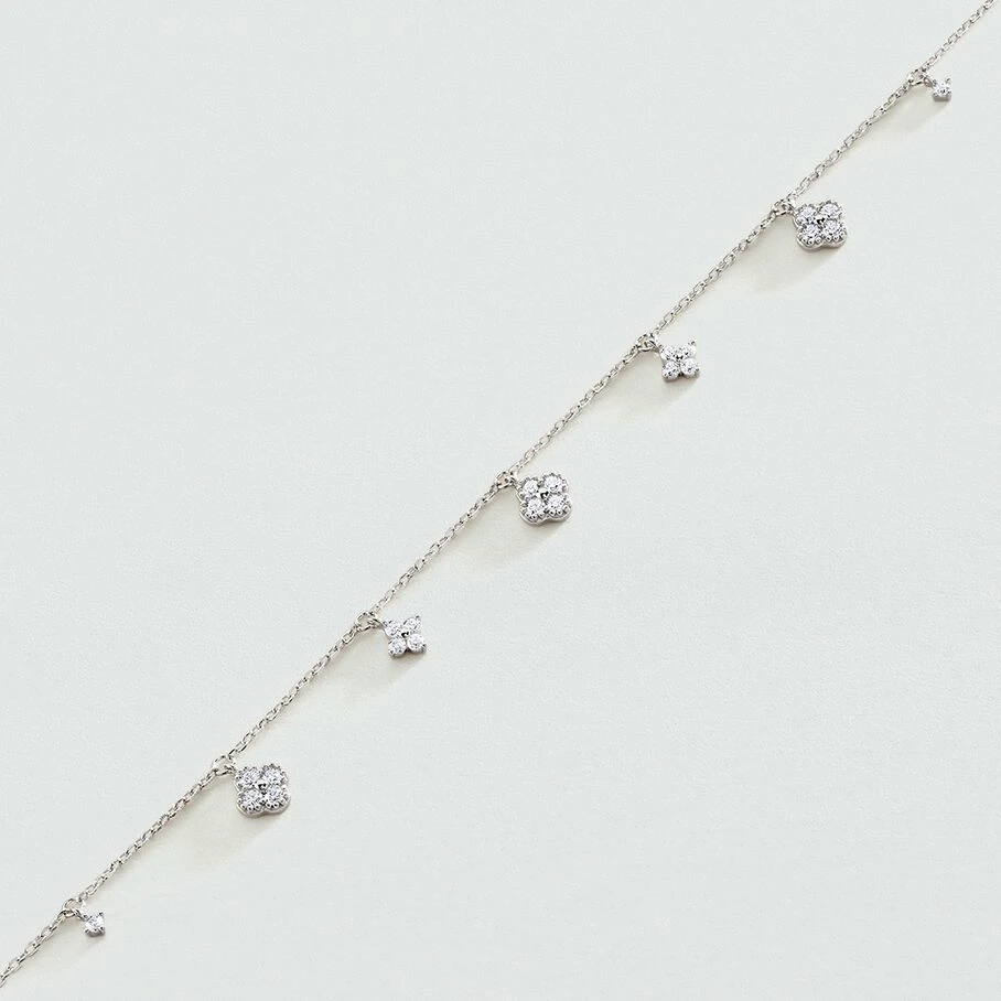 Bracelet chaine, en argent véritable, avec des fleurs d’oxydes de zirconium en pampille et un fin graineti sur le pourtour