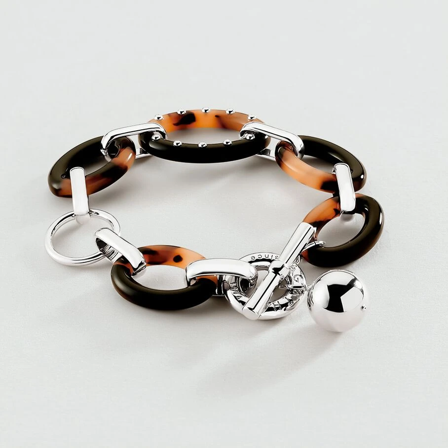 Bracelet en laiton doré 750/1000, avec des maillons ovales en acetate et une boule en métal, fermoir T-bar