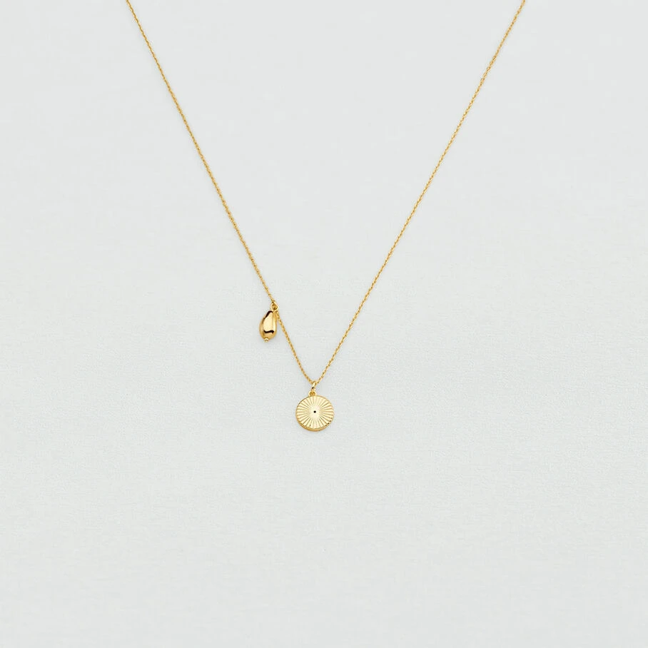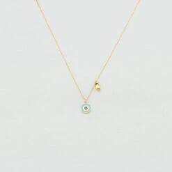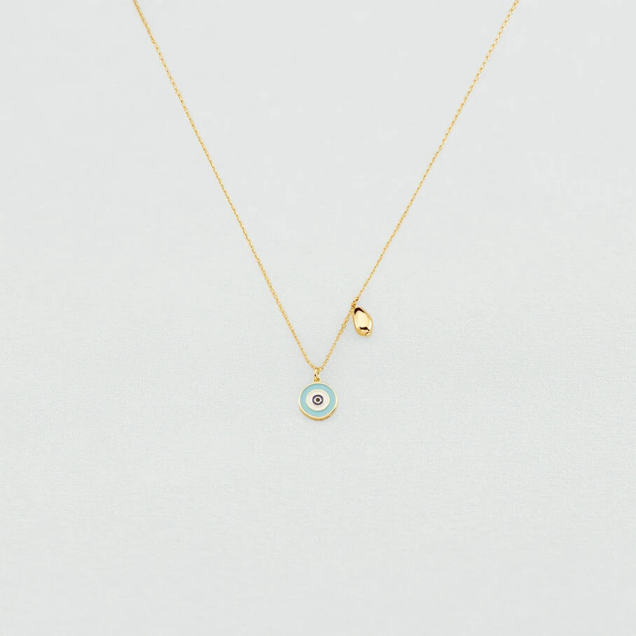 Collier court, en laiton doré à l’or fin, avec un œil turc et un coquillage sur chaine en pendentifs
