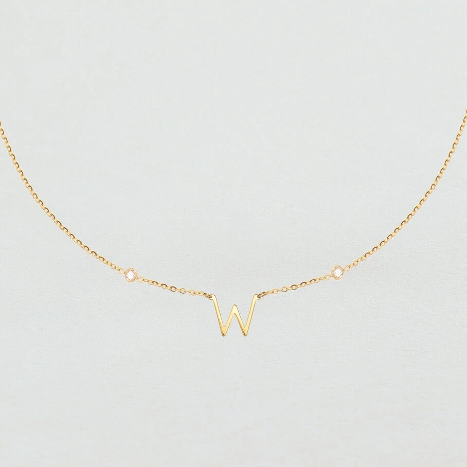 Collier fin composé de la lettre W et de deux oxydes de zirconium. Longueur: 42cm