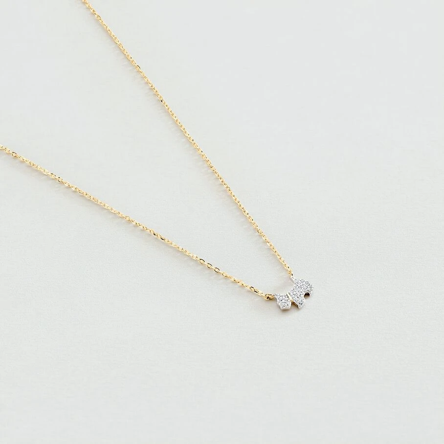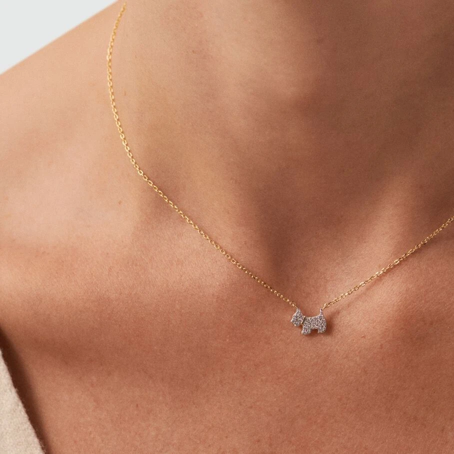 Collier court, sur chaine, en argent véritable doré 750/1000, dont le pendentif en forme de chien est finement serti d’oxydes de zirconium