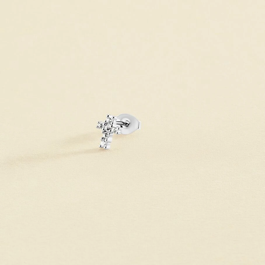 Boucle d’oreille puce en argent véritable en forme de croix pavée d’oxydes de zirconium. A l’unité, pour mieux les mixer et les accumuler.