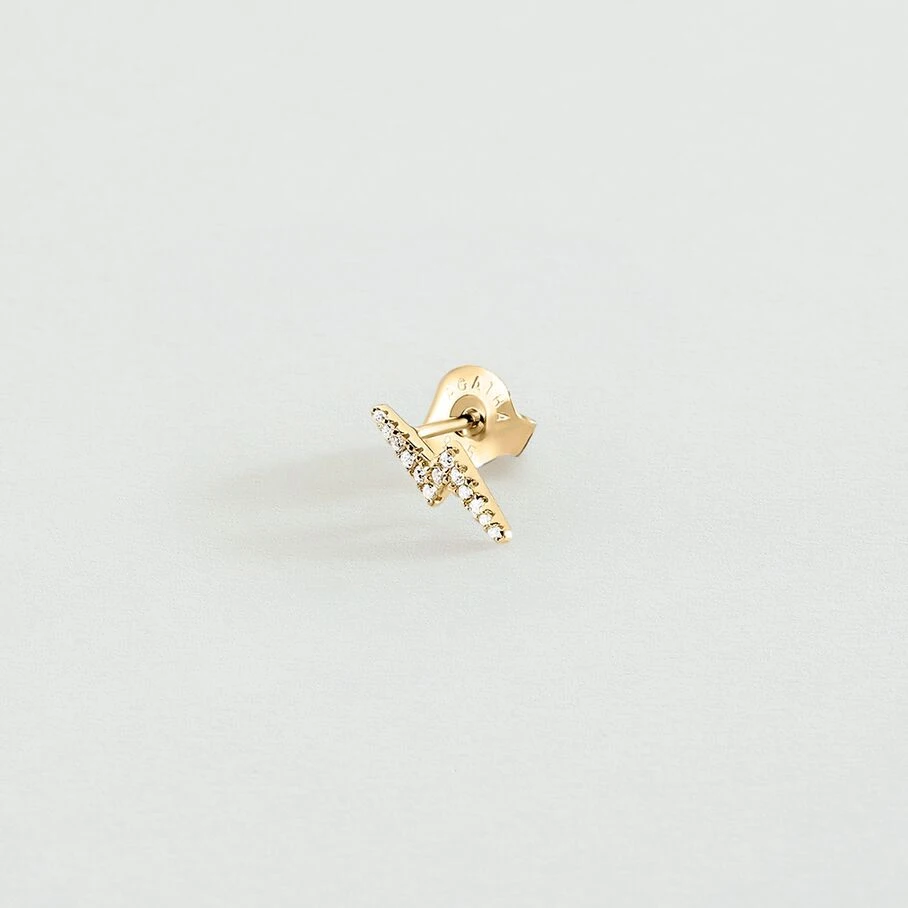 Boucle d’oreille puce en argent véritable doré à l’or fin en forme d’éclair pavé d’oxydes de zirconium. A l’unité, pour mieux les mixer et les accumuler.