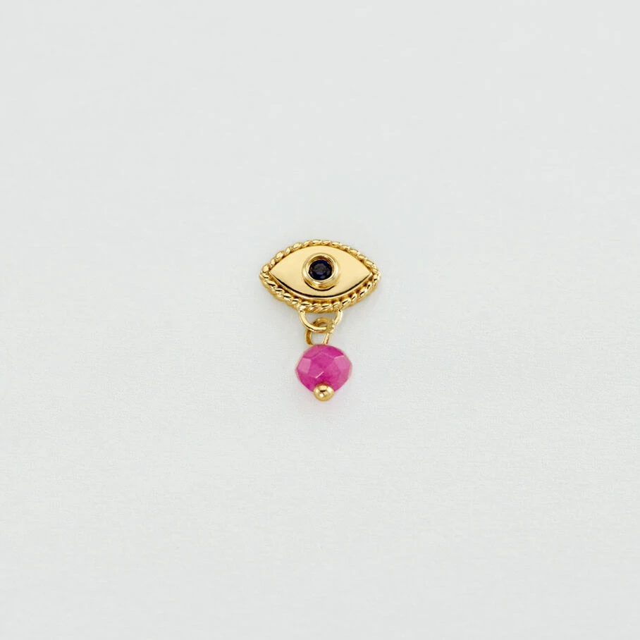 Boucle d’oreille puce à l’unité, en argent 925/1000 et dorée 750/1000, représentant un œil turque. Cet œil est serti d’un oxyde de zirconium. En dessous, vous observerez une pampille de quartz rose.