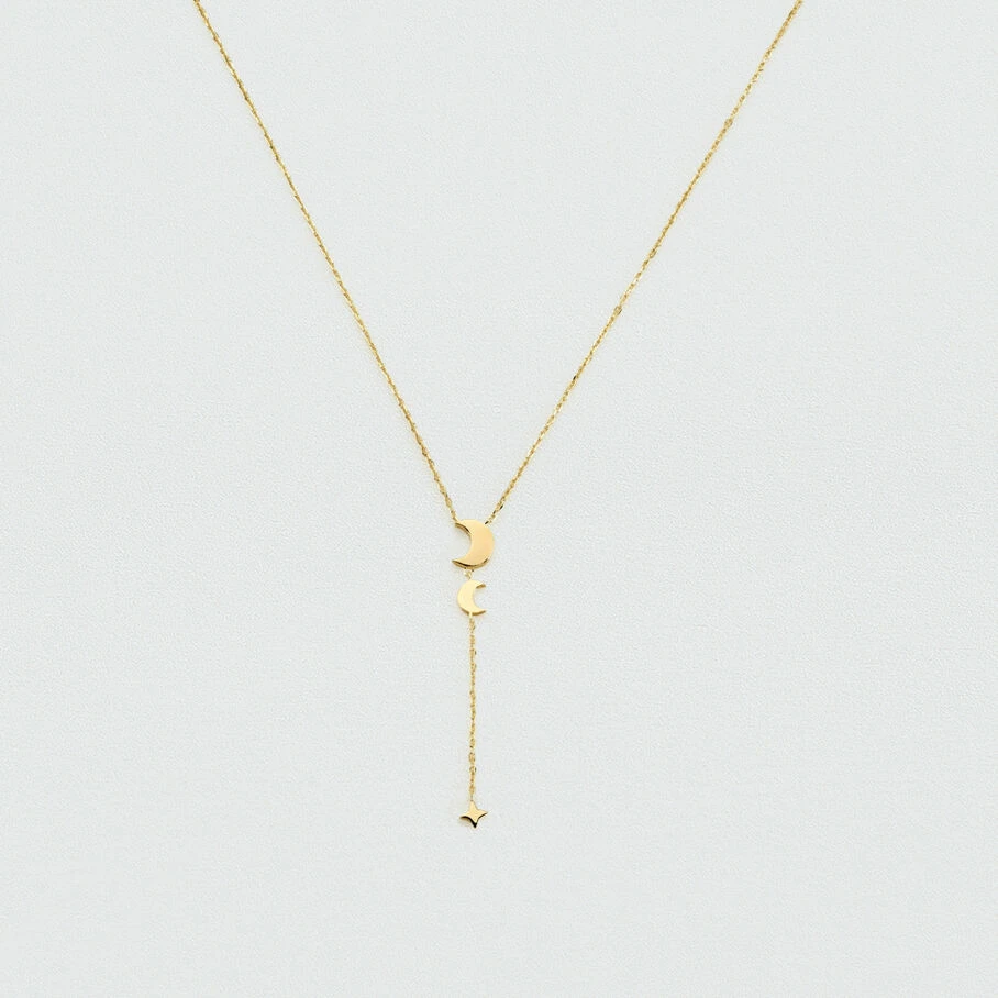 Collier Y, en argent doré 750/1000, dont les pendentifs, sur une fine chaine maille forçat, représentent le cycle lunaire