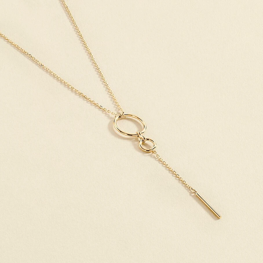 Collier Y, en argent véritable doré 750/1000, avec une fine chaîne sur laquelle sont montés deux anneaux évidés de différentes tailles